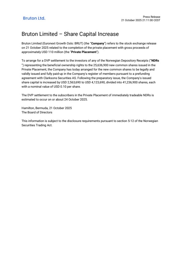 Bruton Limited (Euronext Growth Oslo: BRUT) (the “Company”) refers to the stock exchange release on 21 October 2025 related to the completion of the private placement with gross proceeds of approximately USD 110 million (the “Private Placement“).
